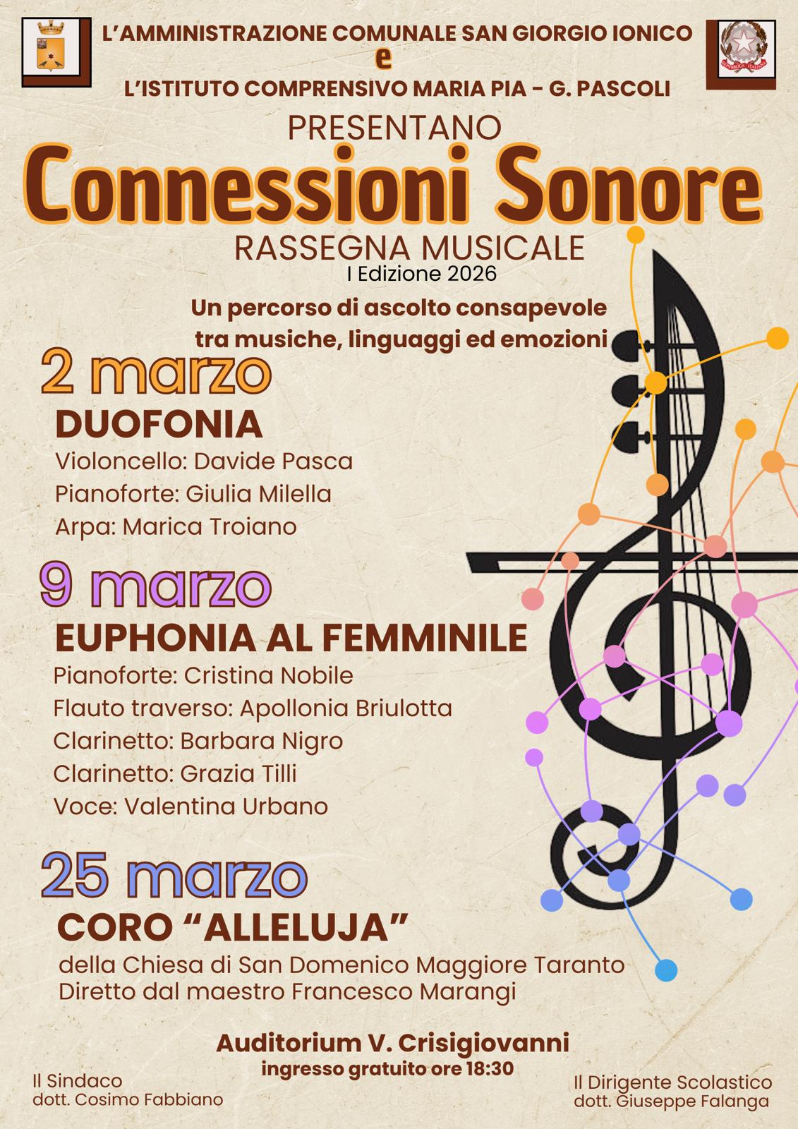Con deliberazione di G.C. n. 22/2026 l'Amministrazione Comunale ha accolto la proposta di collaborazione pervenuta dal Dirigente scolastico dell’Istituto Comprensivo Statale “Maria Pia – G. Pascoli”, tesa a realizzare, nell’ambito delle attività educative e culturali rivolte ai ragazzi/e, la 1^ edizione della Rassegna musicale “Connessioni Sonore”, progetto finalizzato alla promozione dell’ascolto consapevole e alla valorizzazione del linguaggio musicale come strumento di dialogo tra studenti, artisti e comunità locale.