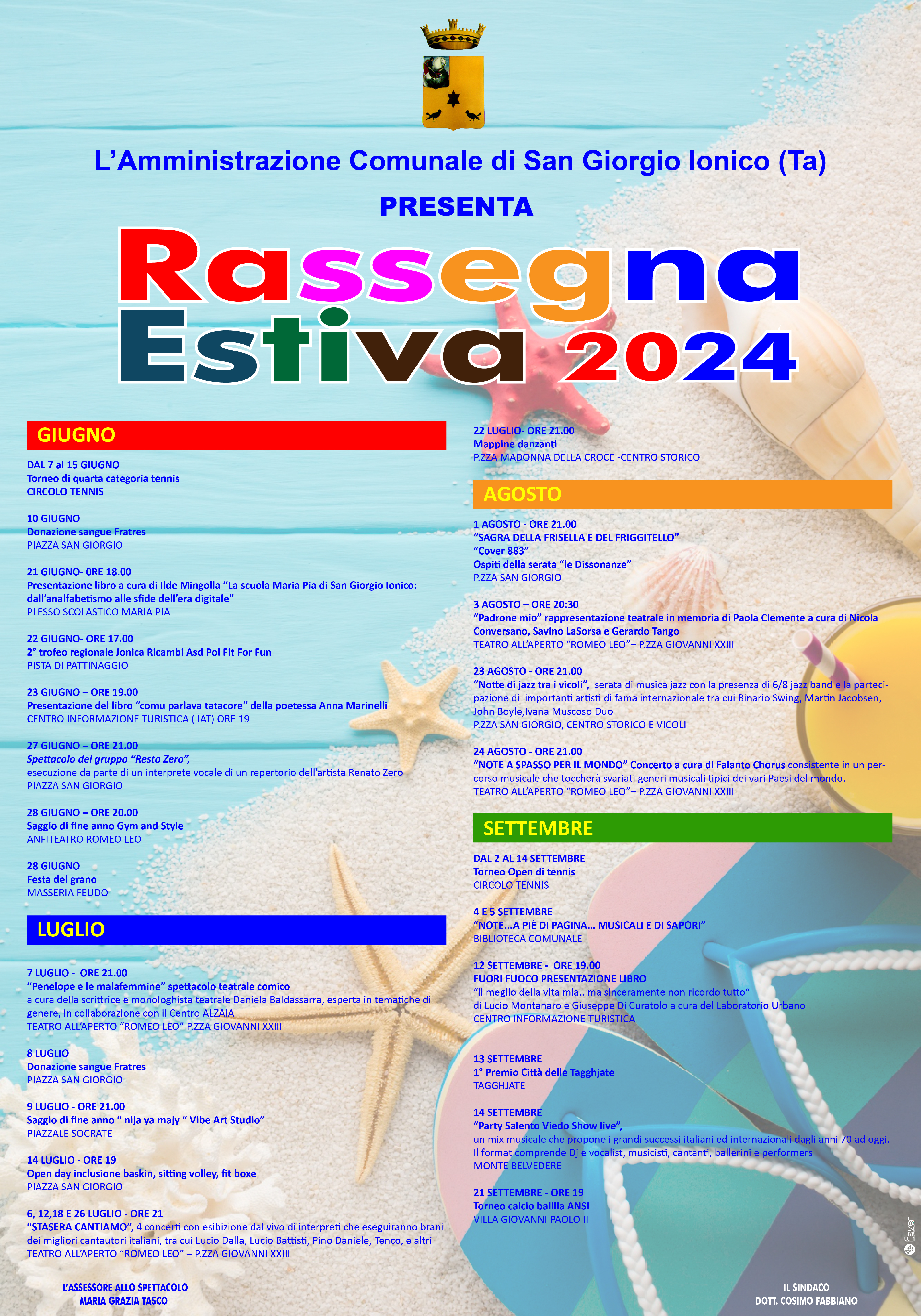 Con deliberazione di G.C. n. 82 del 14 giugno 2024, immediatamente esecutiva, questa Amministrazione ha approvato il programma delle manifestazioni artistiche, musicali e culturali da offrire, a titolo completamente gratuito, alla comunità sangiorgese nel periodo estivo.