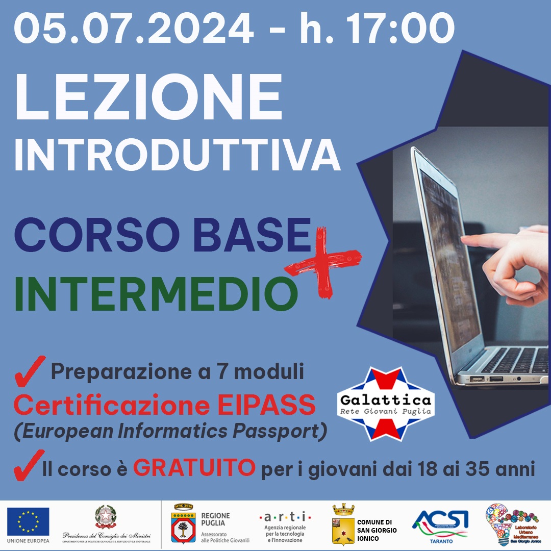 Venerdì 5 Luglio inizia il Corso Base di Informatica con una lezione introduttiva gratuita per tutti. Durante la lezione verrà svolto un test interattivo, mediante l’utilizzo dello smartphone, grazie al quale si potranno mettere alla prova le proprie competenze informatiche. Il Corso Base di Informatica durerà 50 ore e si svolgerà ogni martedì e giovedì dalle 16:30 alle 19:30, in presenza, presso il nostro Laboratorio Urbano Mediterraneo, in via Trento a San Giorgio Jonico.